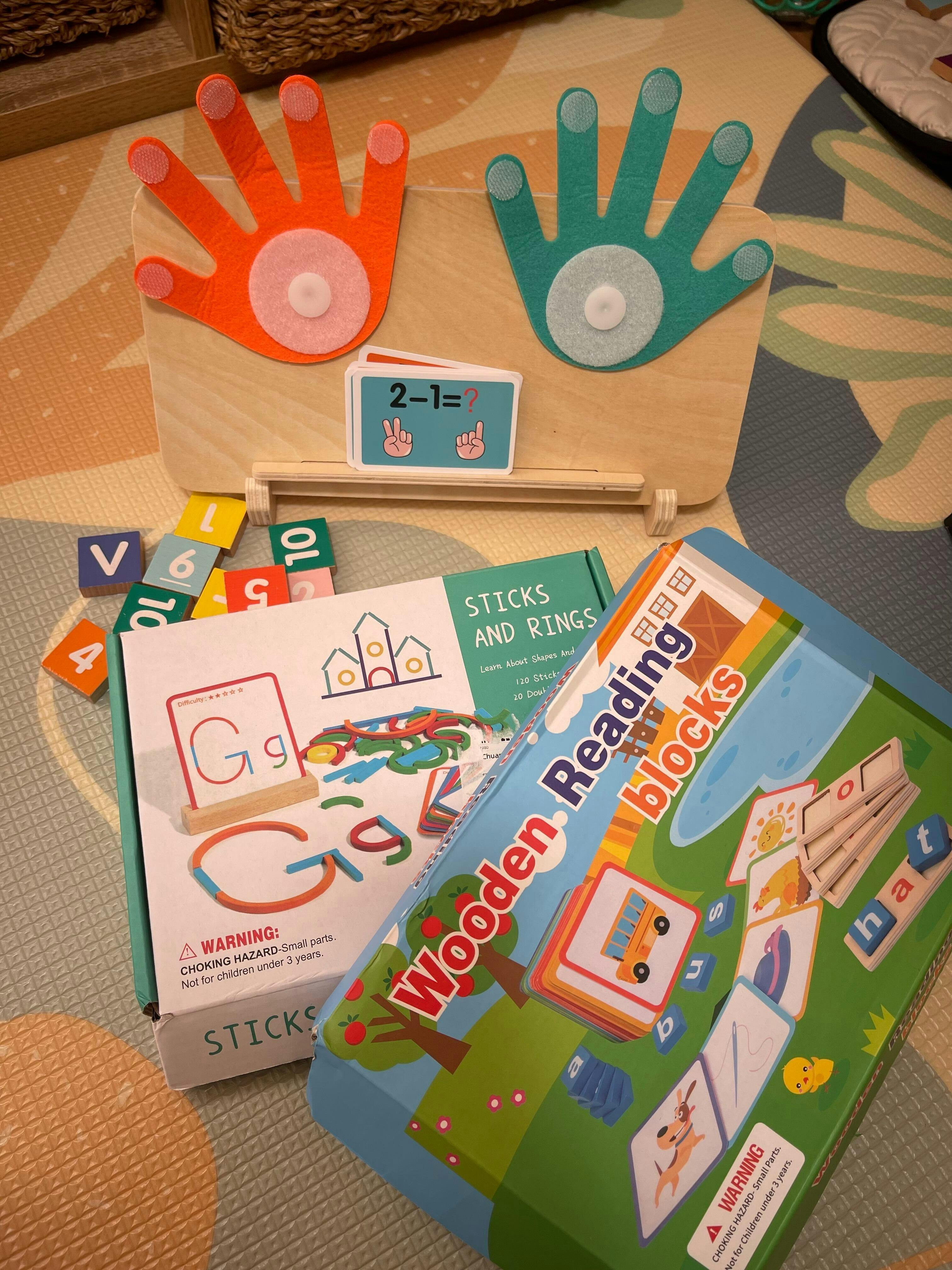 - Finger Counting Math Toy – Helps children visualize numbers and learn basic arithmetic using wooden finger boards and number cubes.